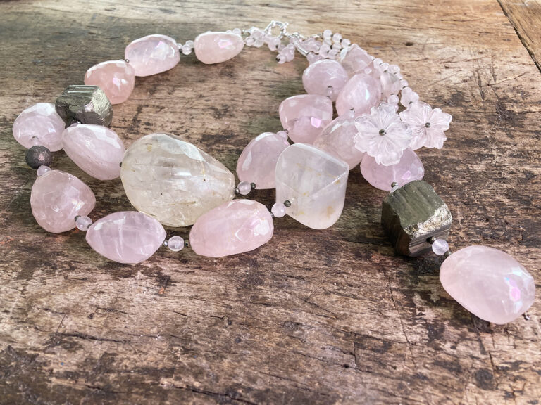 Collier Piece Unique « Rose de Mai » quartz rose, quartz, pyrite de fer
