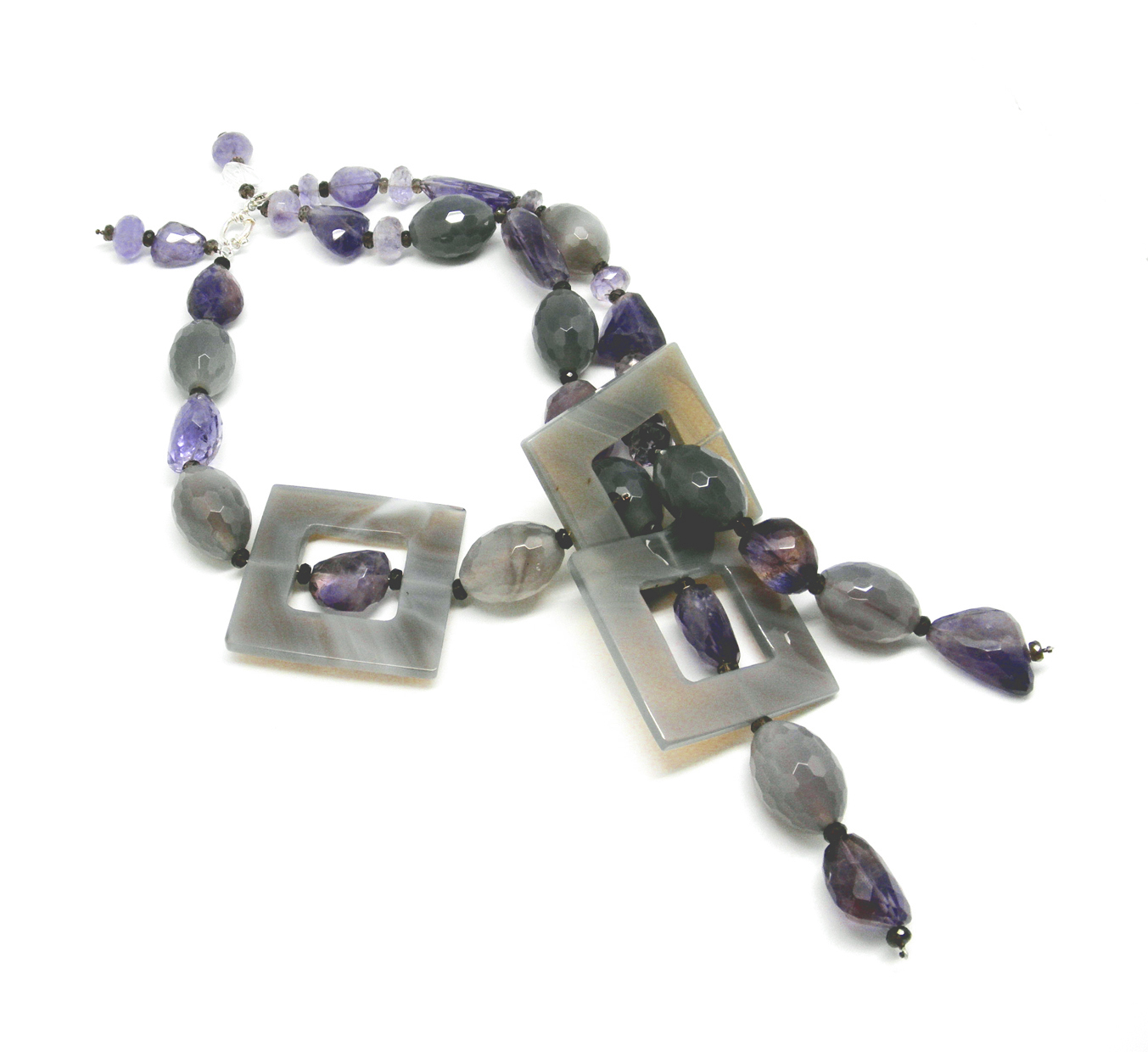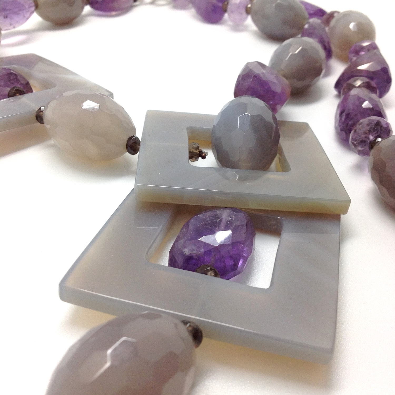 Collier Pièce Unique: Carré en agate grise & Améthyste