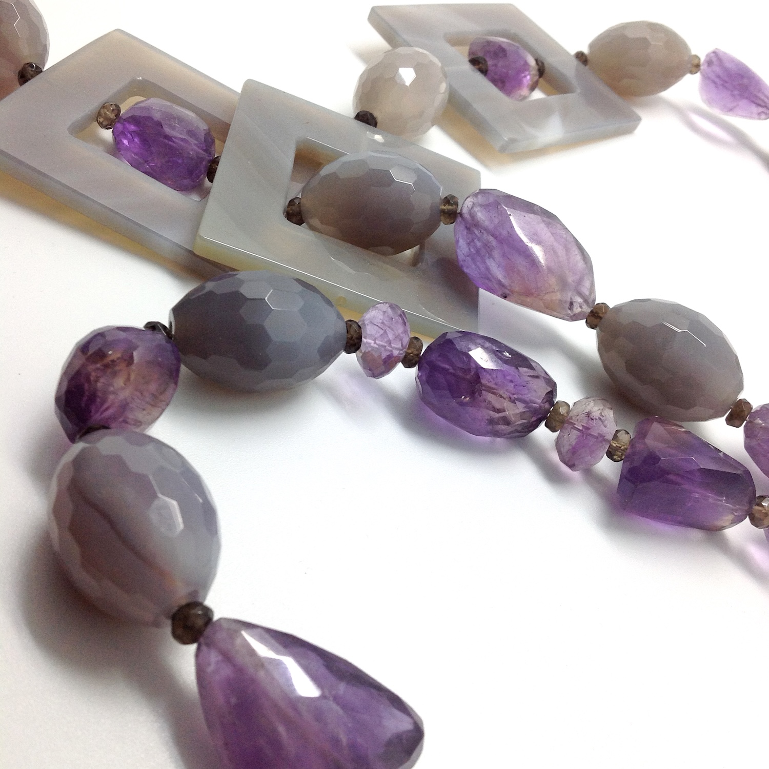 Collier Pièce Unique Carré en Agate grise, quartz fumé & Améthyste