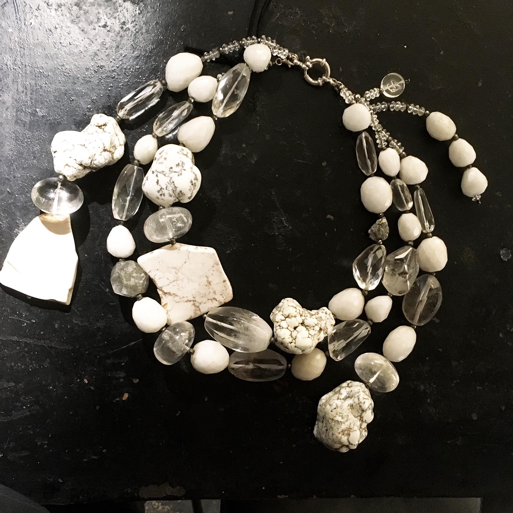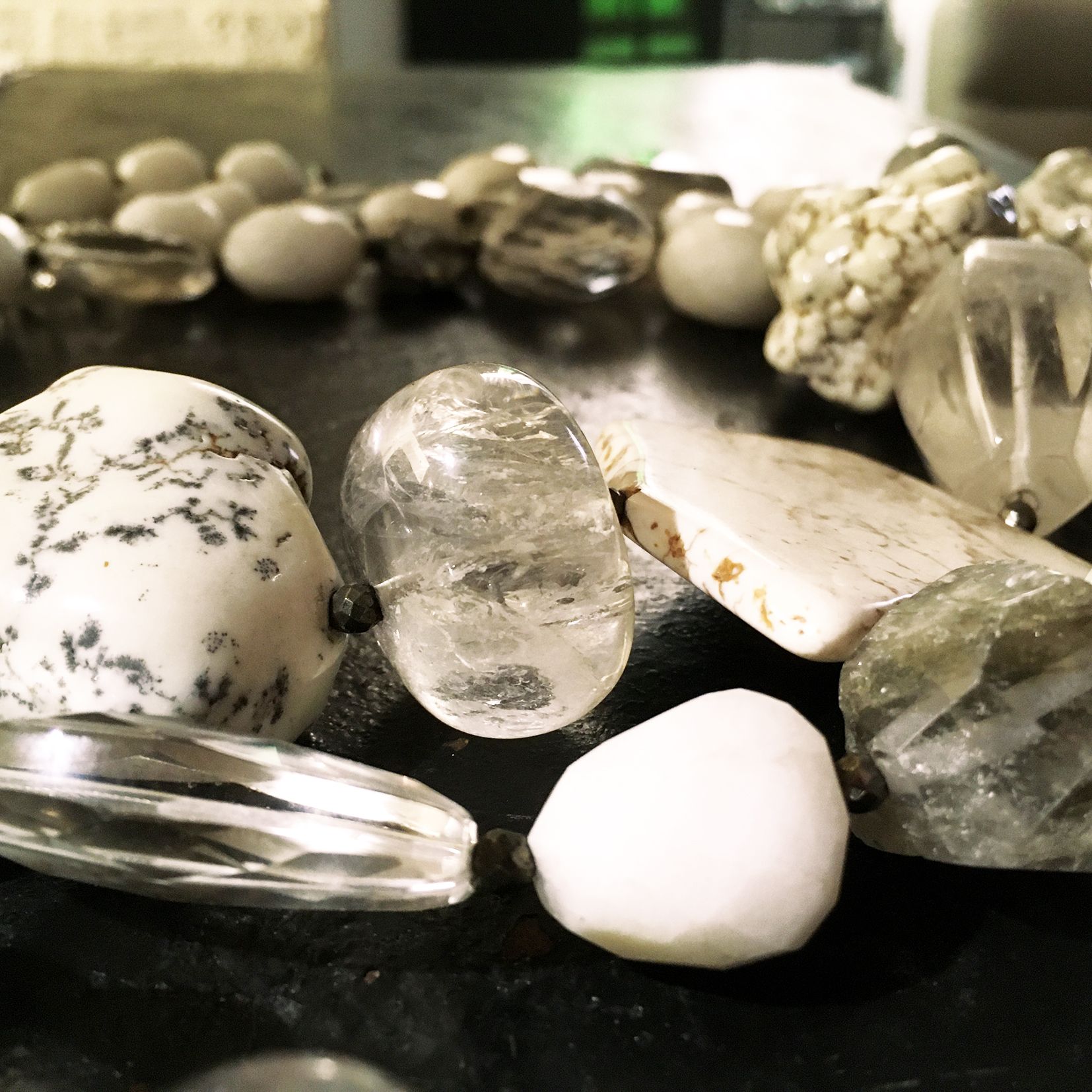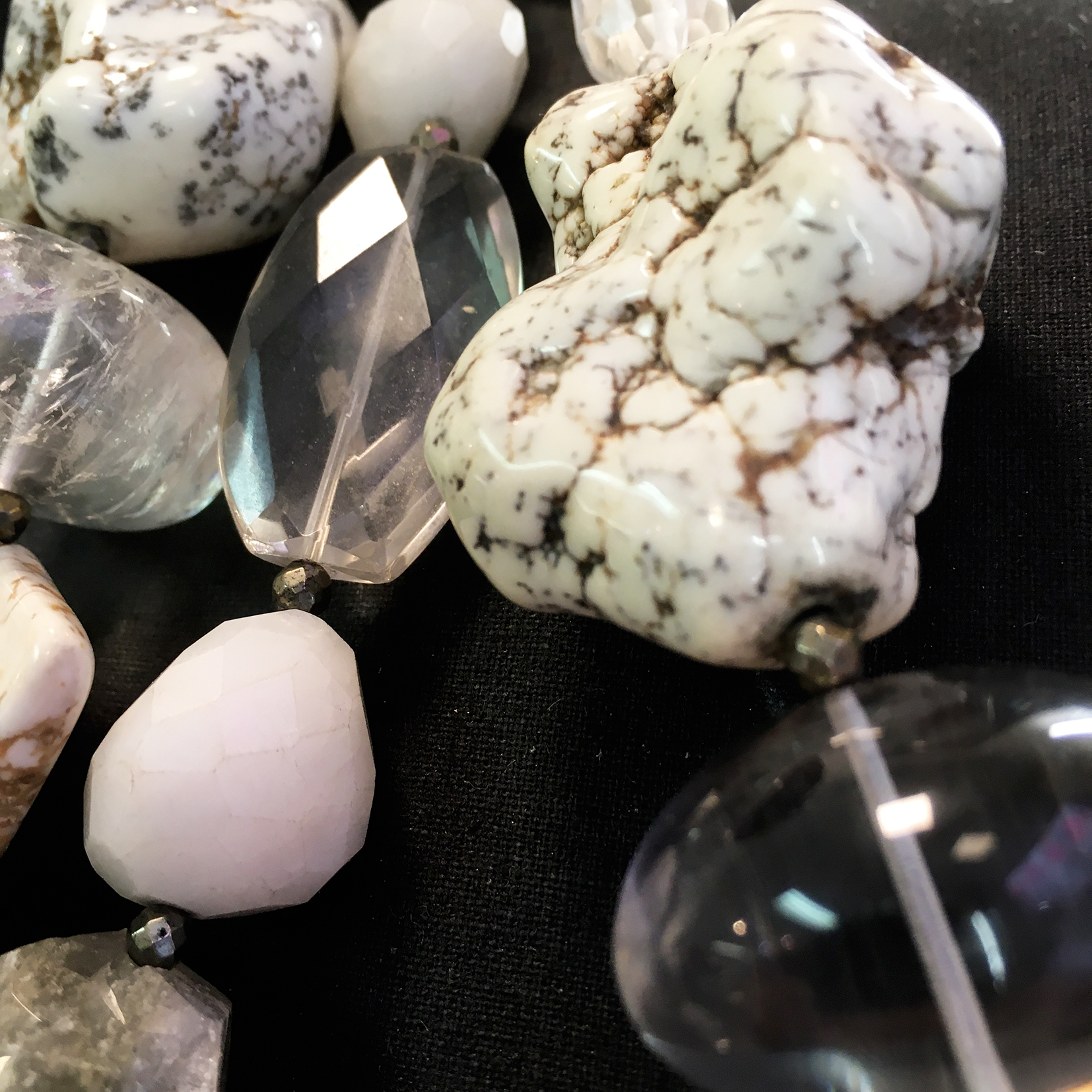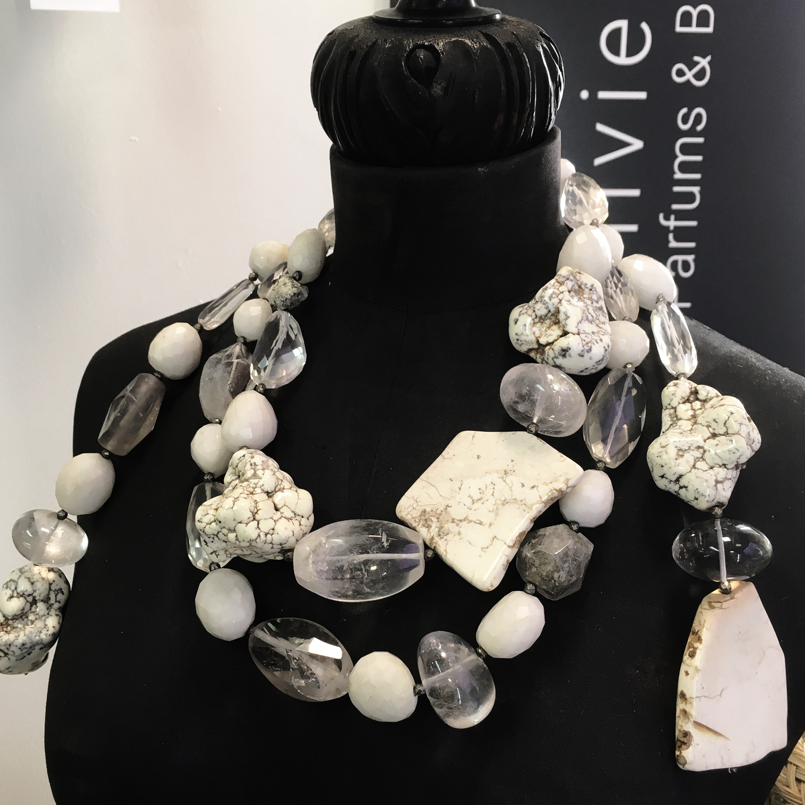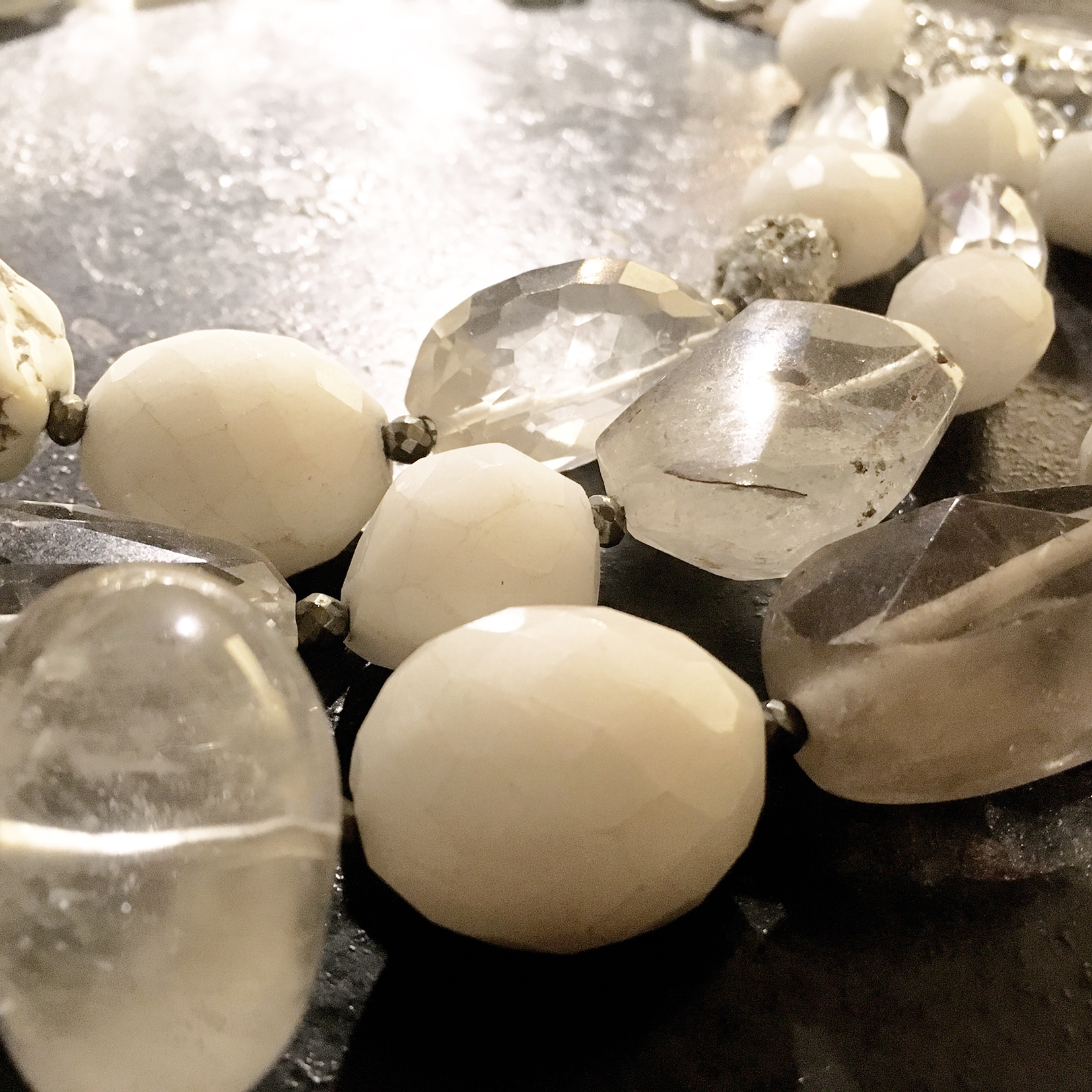 White Smoke – Fumée Blanche – Collier 2 rangs & 2 liens, Agate blanche, Quartz, Cristal de roche, Pyrite de fer