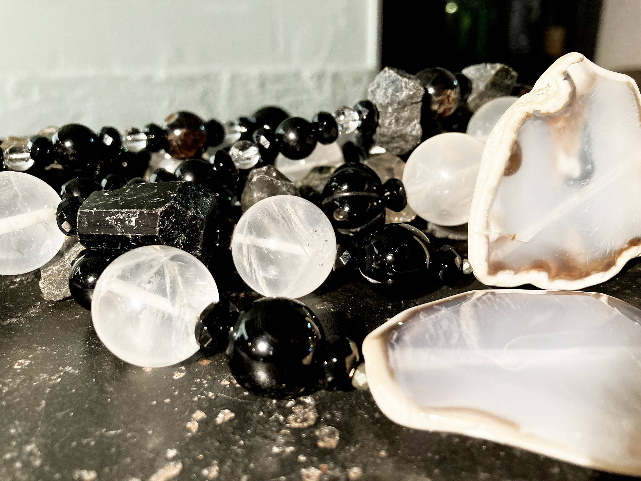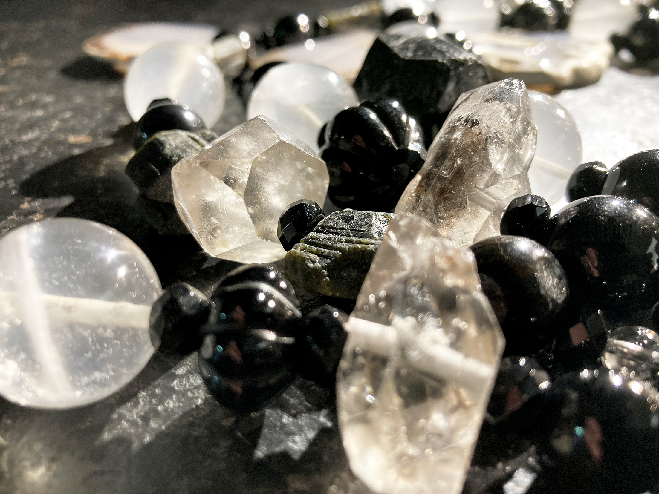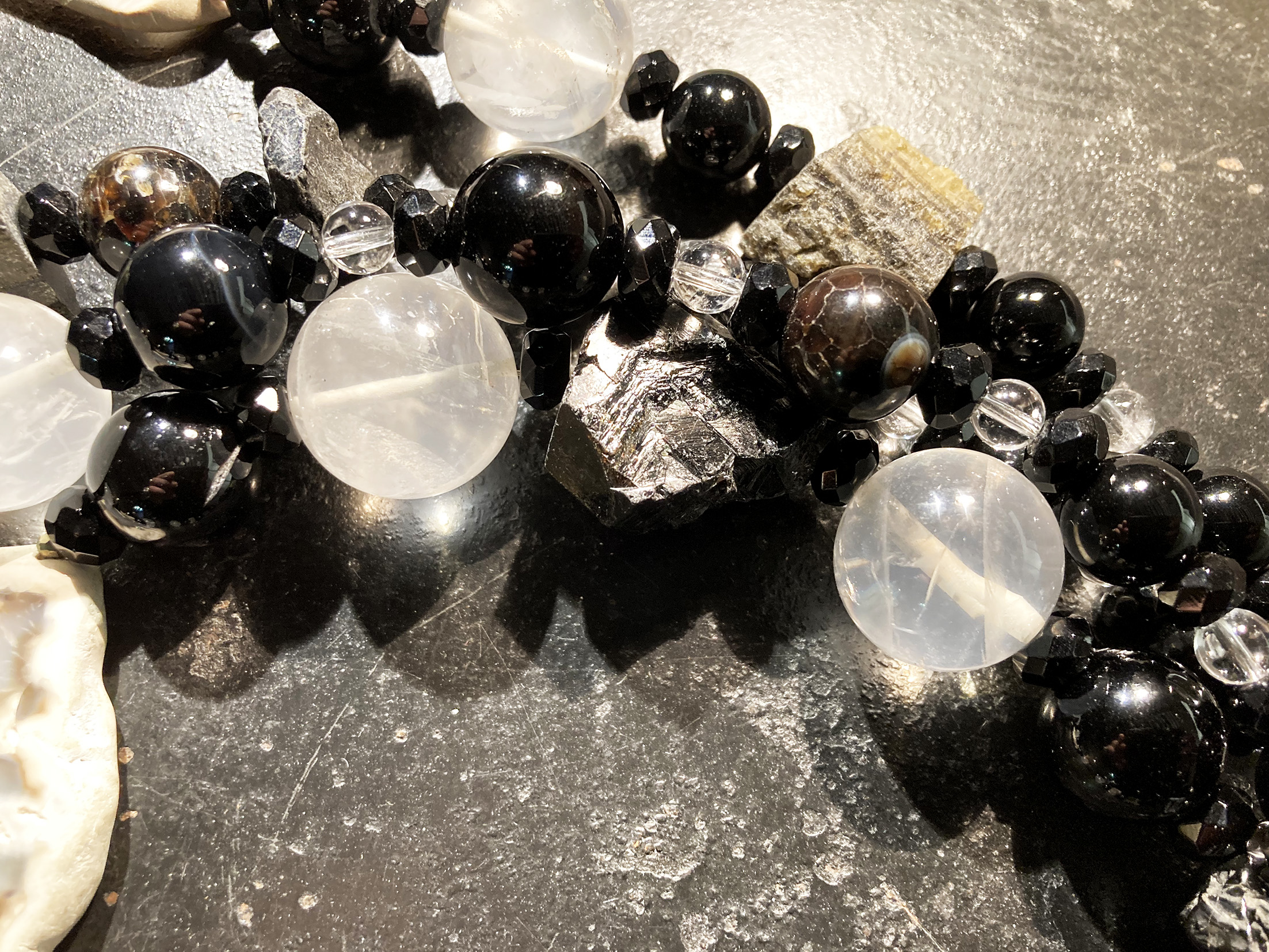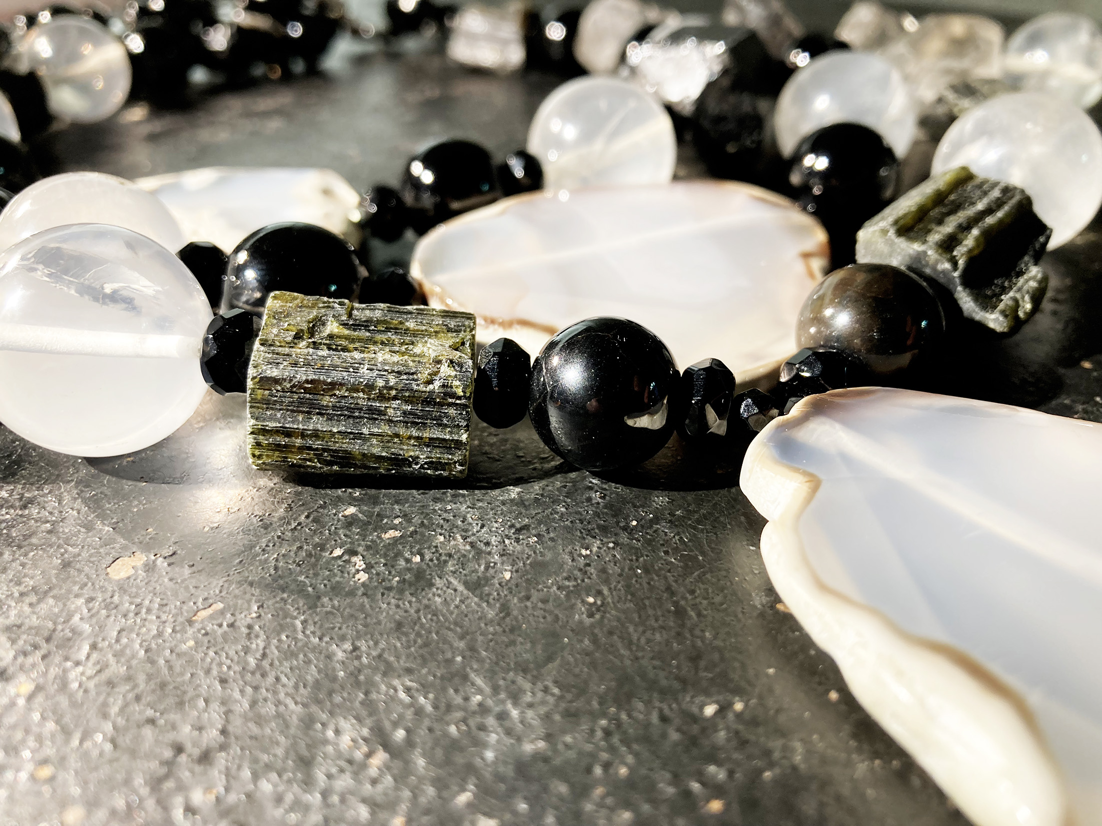 Collier Piece Unique « Love ReBirth » quartz, agate noire, tourmaline noire, cristal de roche