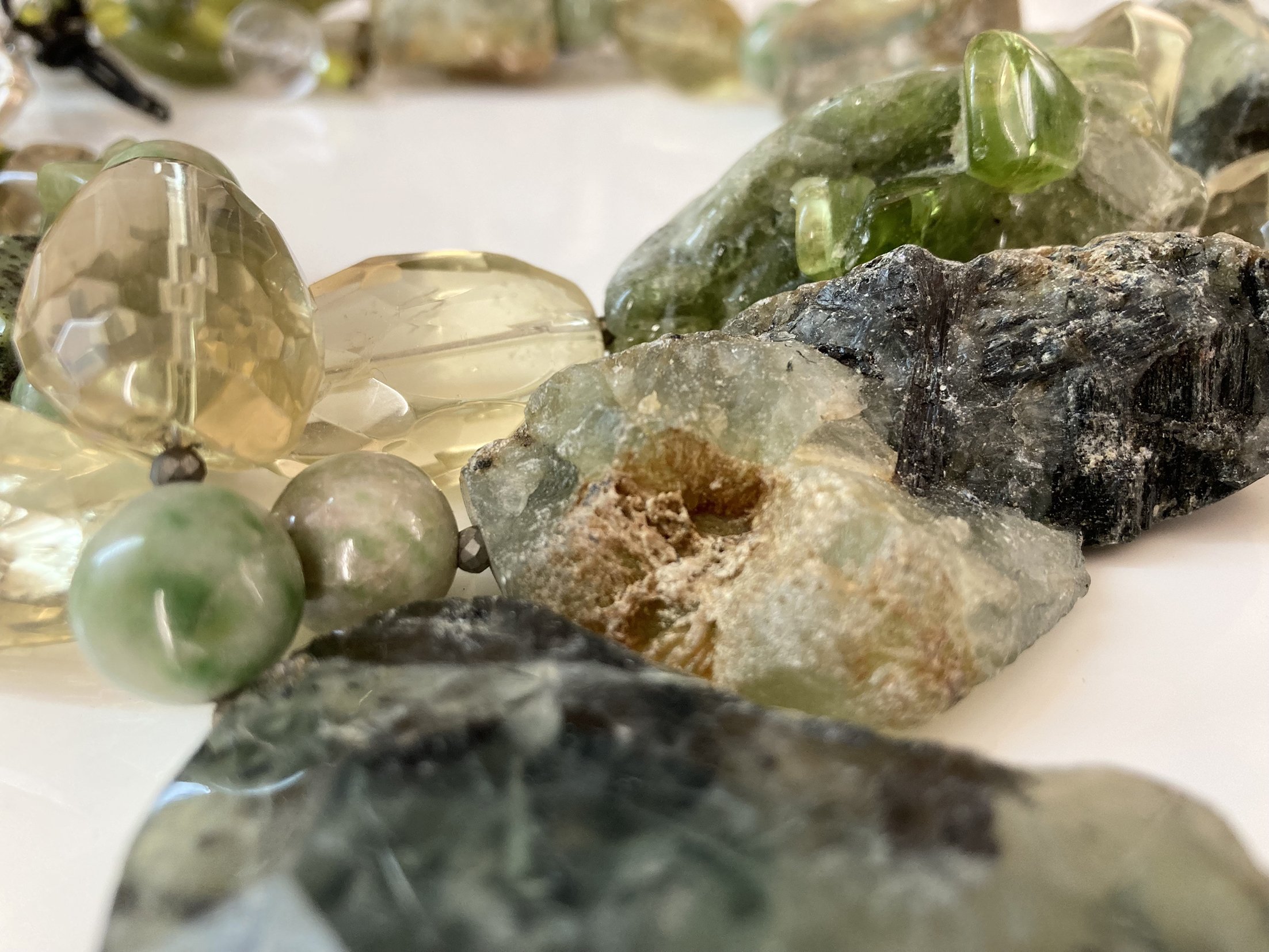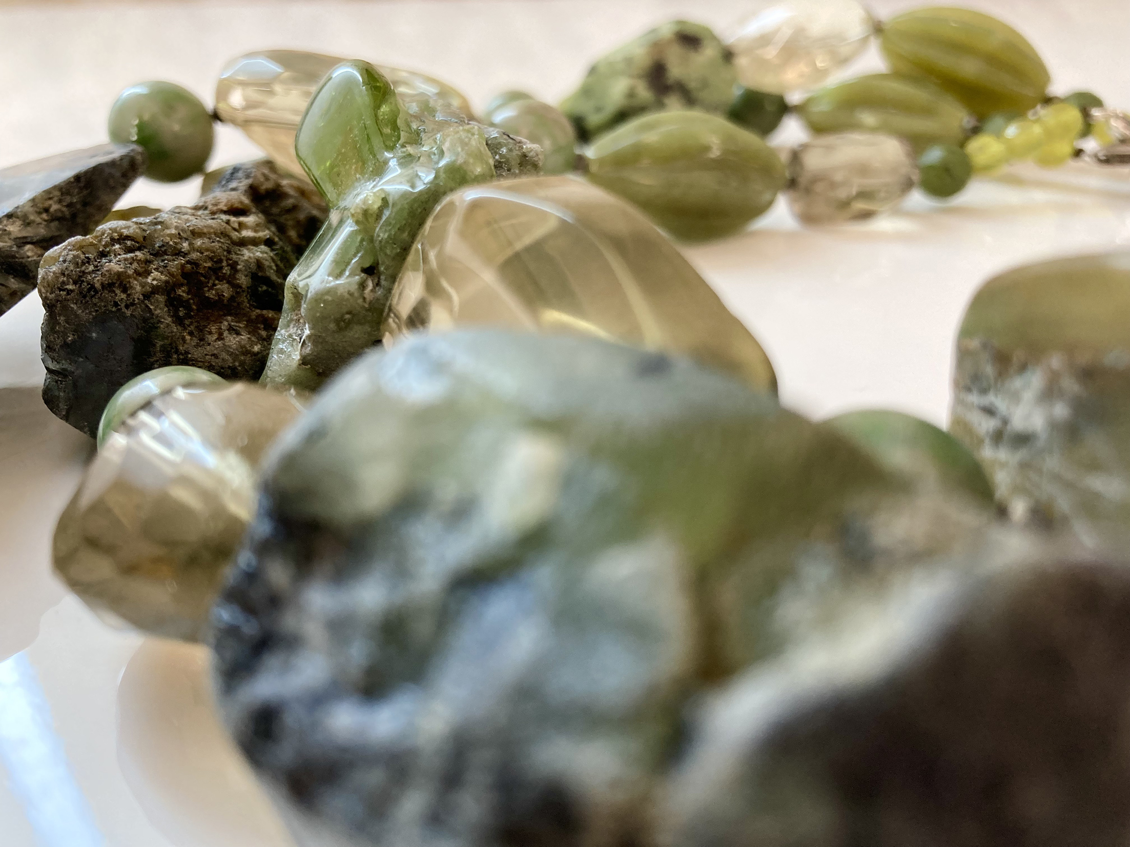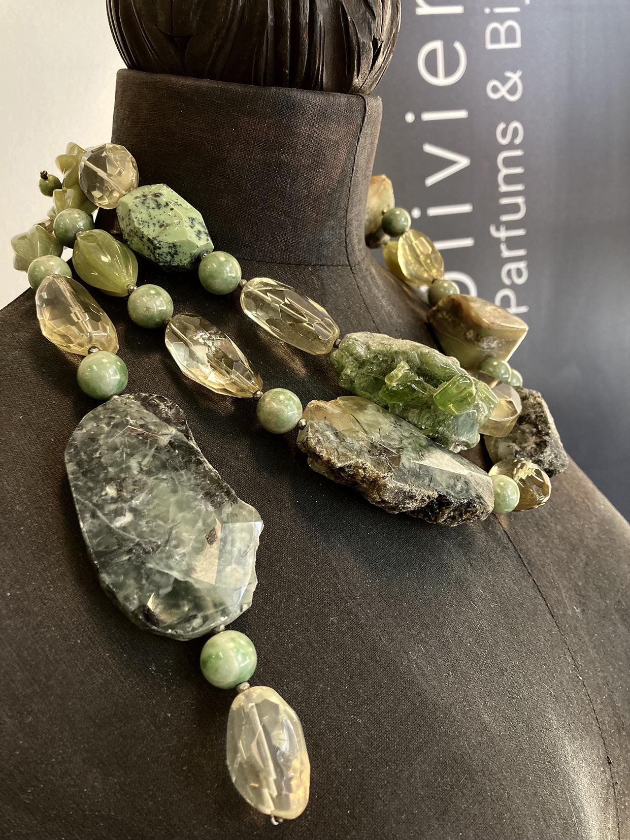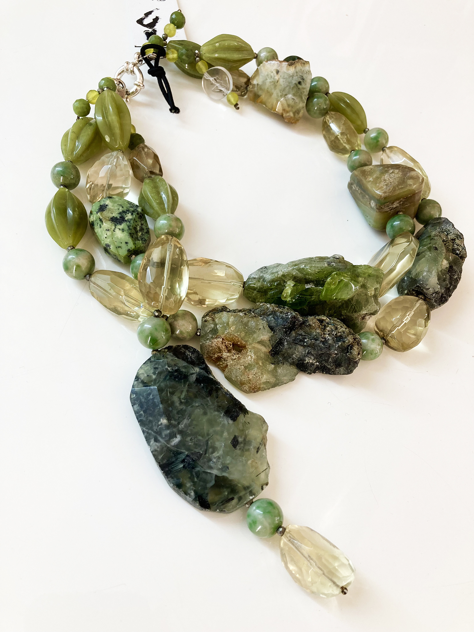 Collier Pierres Véritables – Piece Unique « Green Light » Prehnite, Quartz Lemon, Serpentine, Jadeite, jaspe