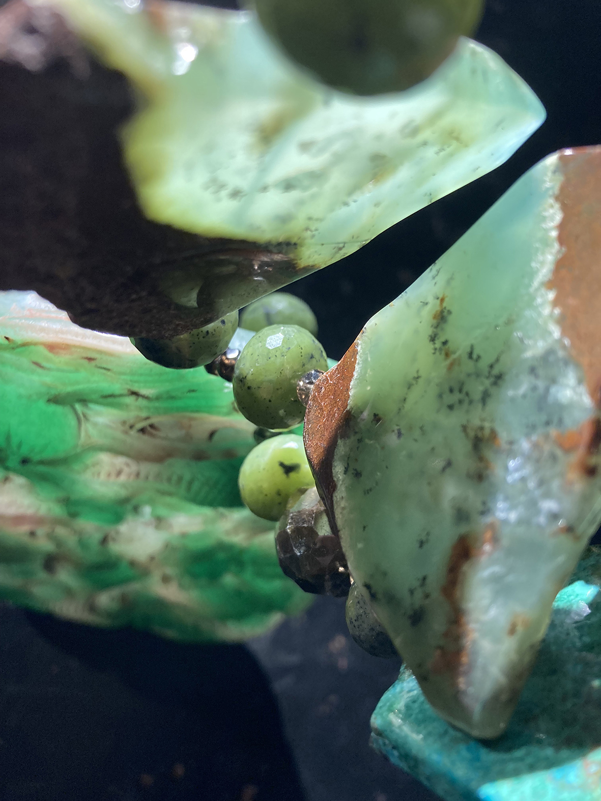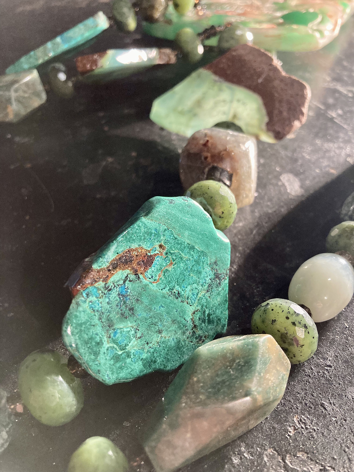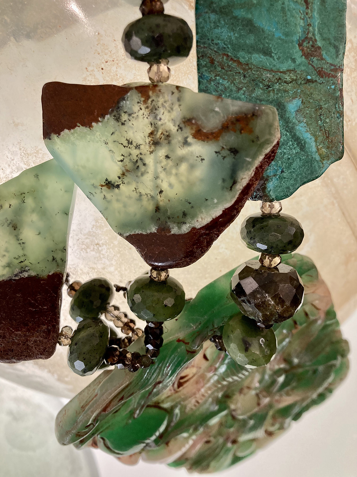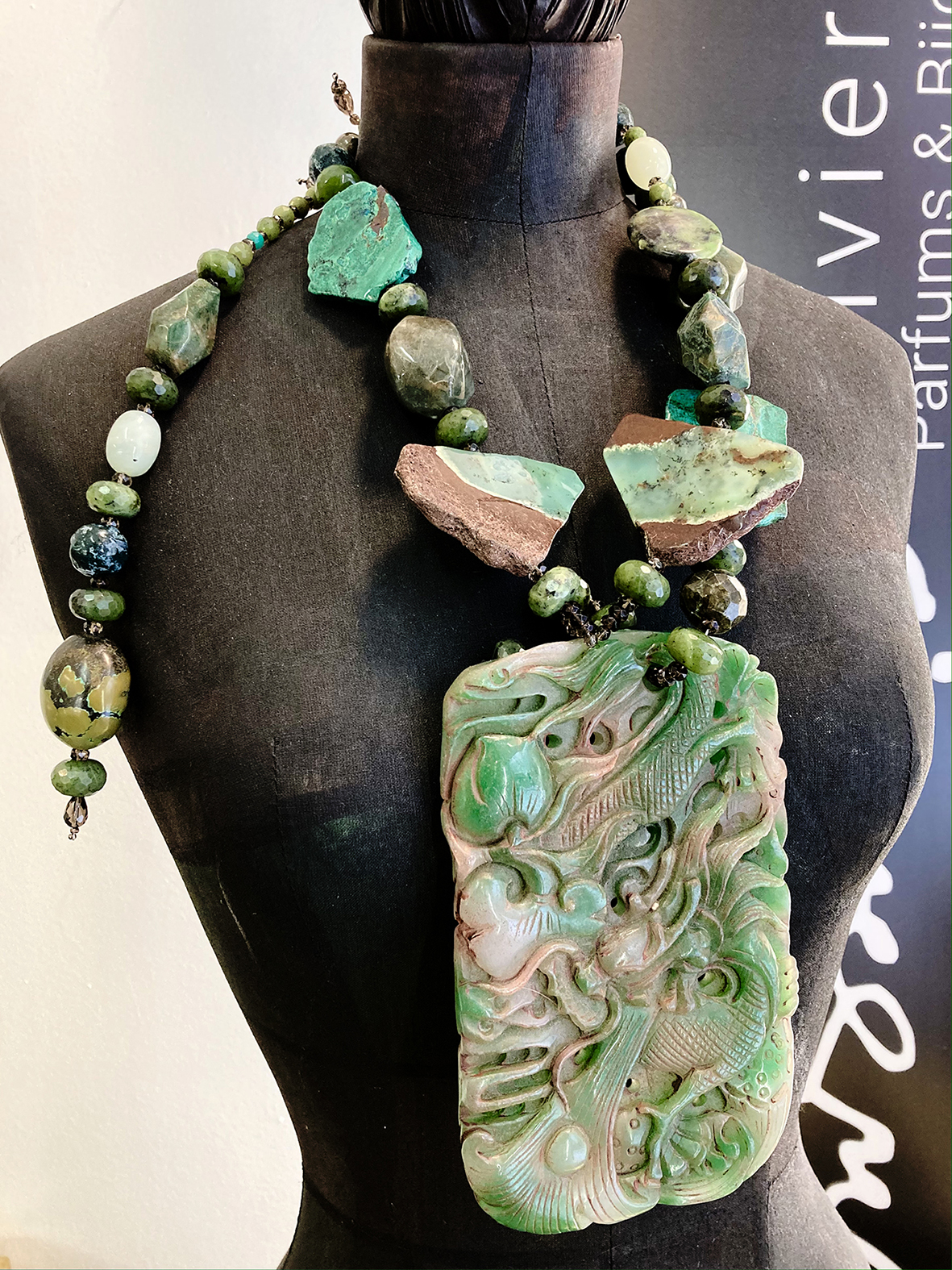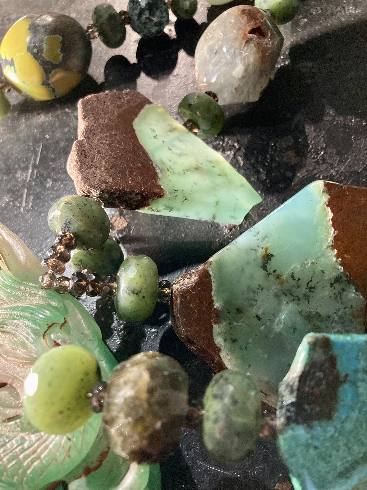 Collier en Pierres naturelles – Pièce Unique « Green Mood Jade » en Jade (jadeite), turquoise ancienne, quartz, quartz fumé, agate, chrysocolle, chrizoprase