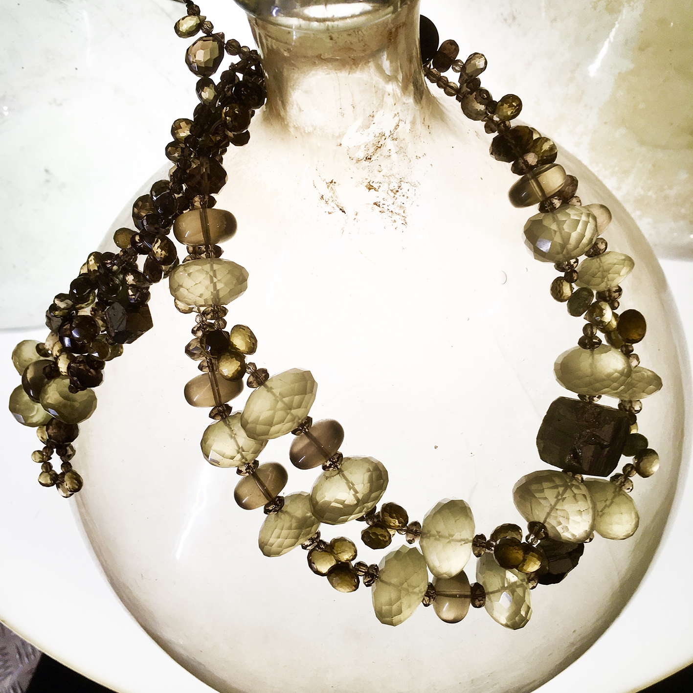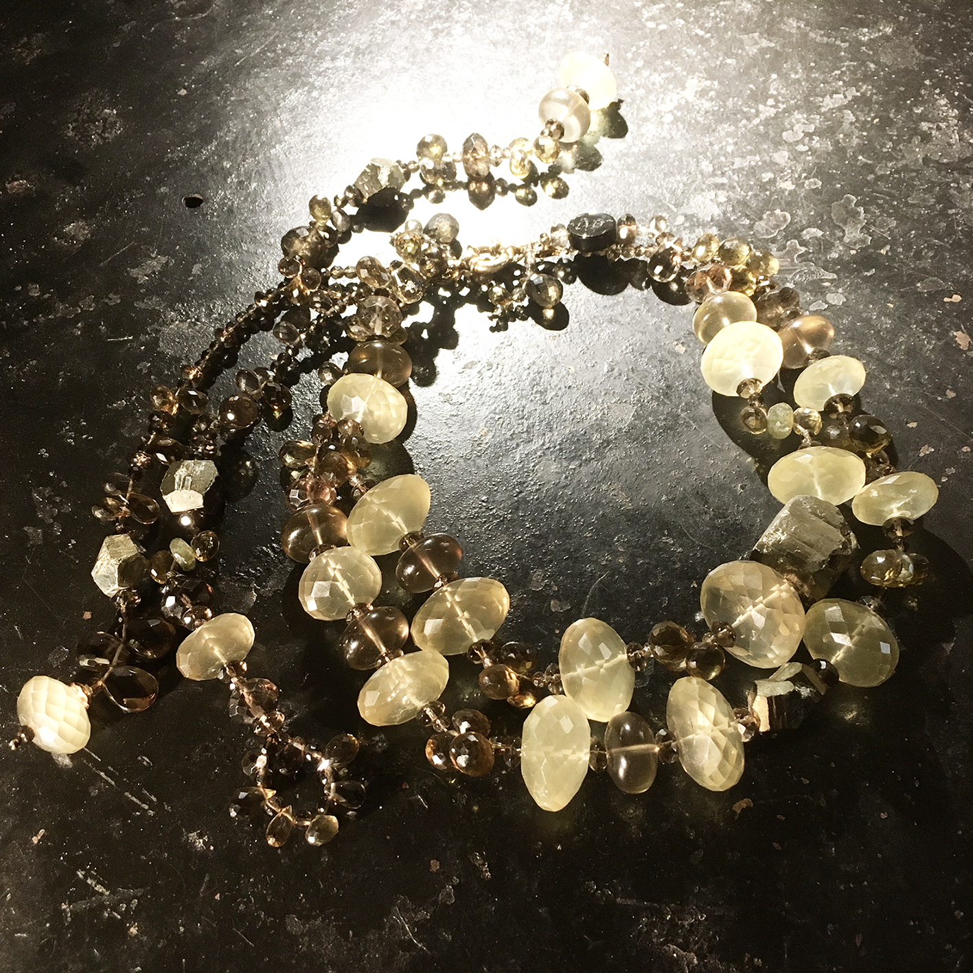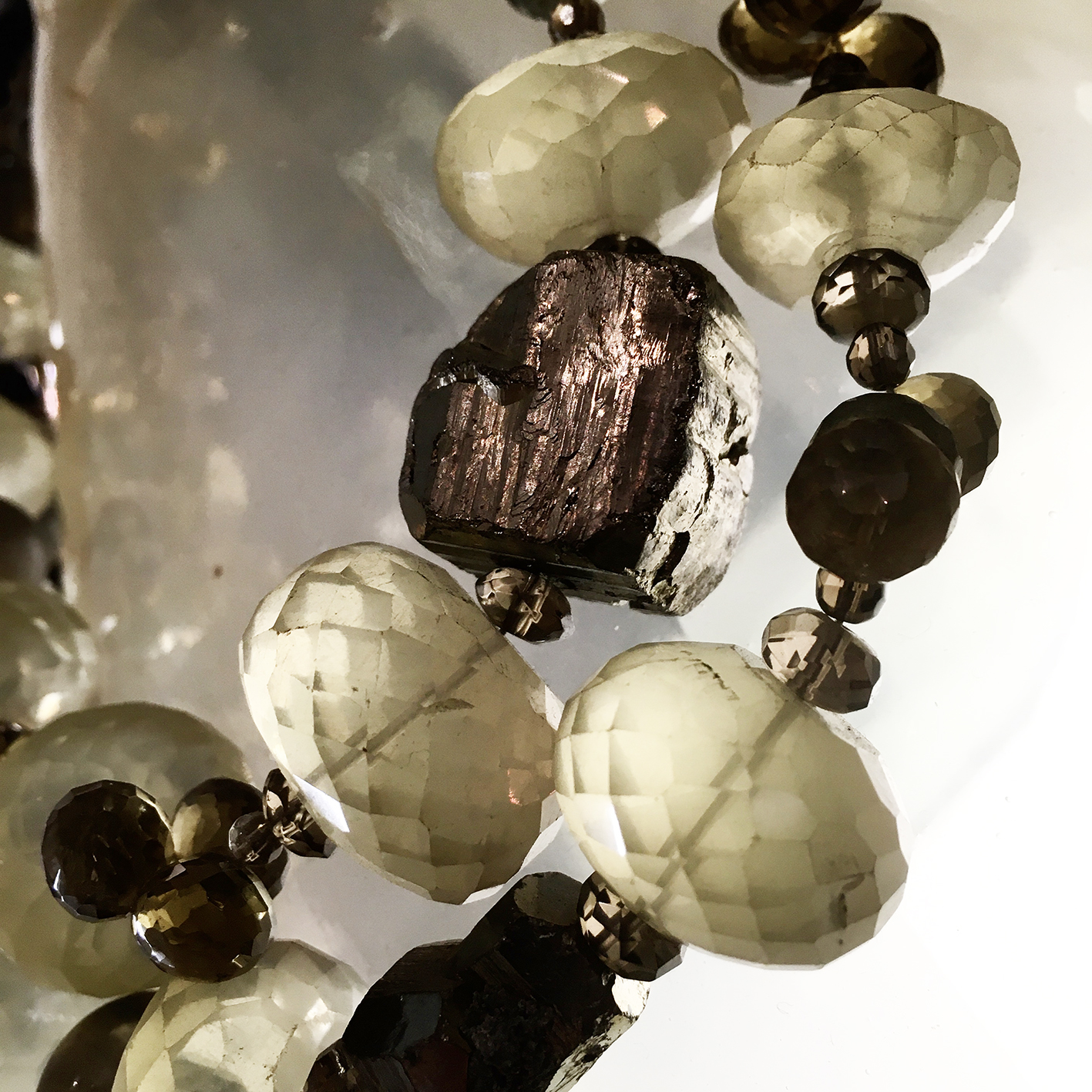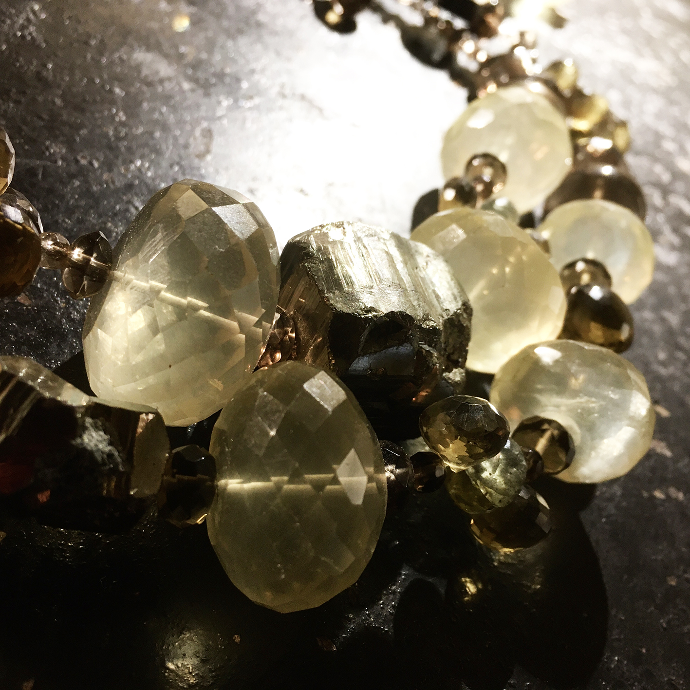 Collier Pierres Véritables – Piece Unique « Solis » Quartz Lemon, Pyrite, Quartz Fumé